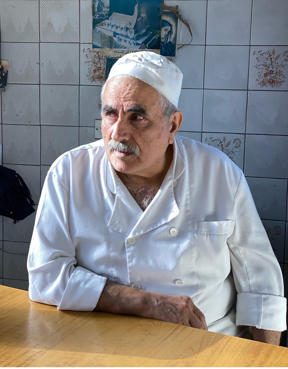 Most of the time, the dough used is the same as that for pita but if you go south, you will be able to have mana2ish with a slightly textured spiced dough used to make mishtah, a typical southern flat bread. Both are delicious but those I loved and can sadly no longer enjoy were those made by Emile, the lovely baker near my mother’s home in Ballouneh — here he is below, sitting at his desk as he used to do when he wasn’t baking.