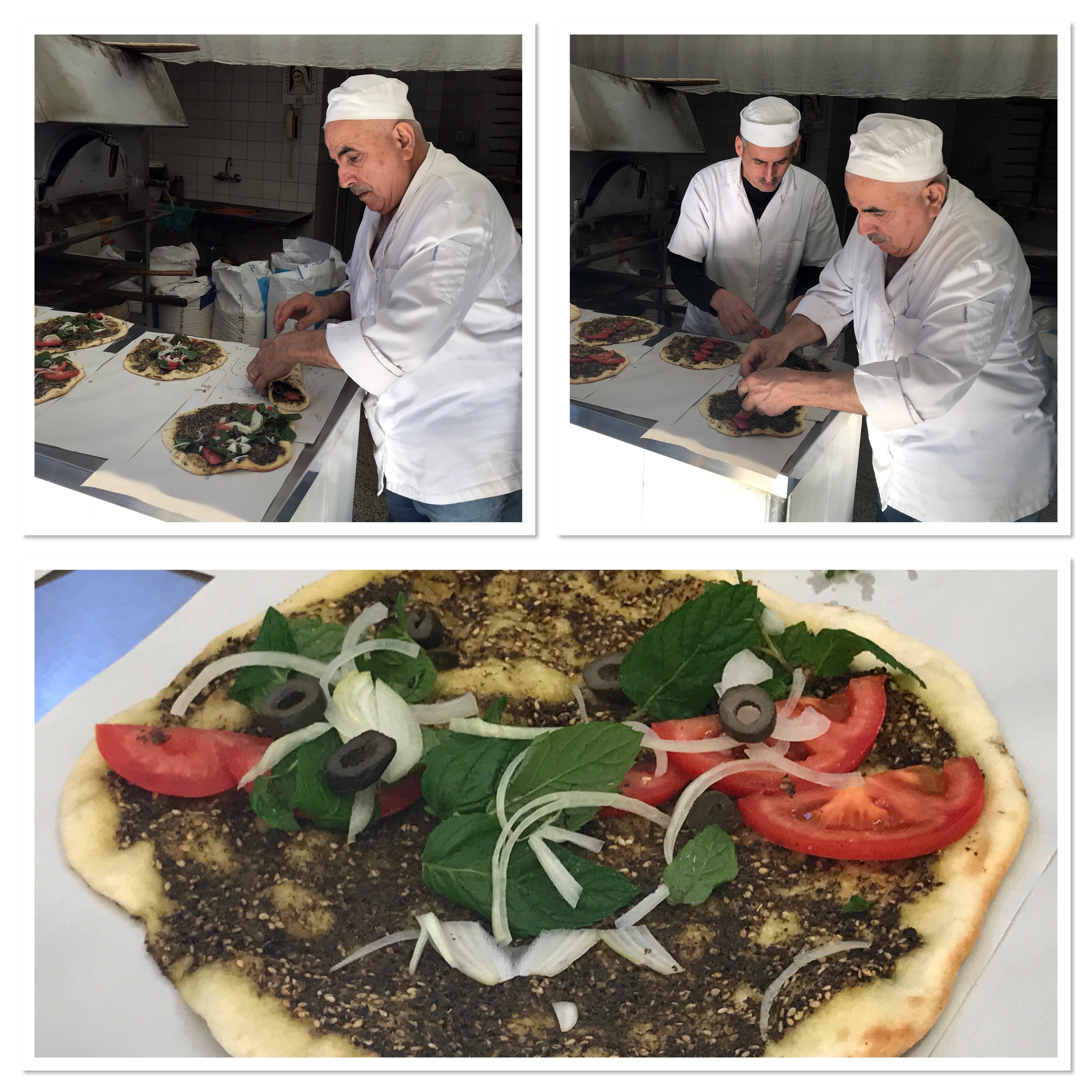 Below are pictures of Emile garnishing mana2ish (he’s working with Reda, his faithful employee who is now back in Egypt, hopefully still making mana2ish) that he sold in his bakery; and further below, a picture of my mother’s man2usheh, made with Emile’s excellent dough but with her za3tar mix and evoo. Her garnish had no onions. Instead she added labneh to the fresh mint and tomatoes which were cherry instead of regular ones. She also pitted the green olives as she, or I for that matter, wouldn’t dream of using ready pitted ones — they taste like rubber.